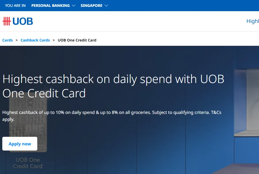 2. 高返现上限首选:UOB One Card,月度返现上限最高(S$250),但豁免门槛高、无协同返现,适合高消费、不依赖储蓄账户协同的家庭;