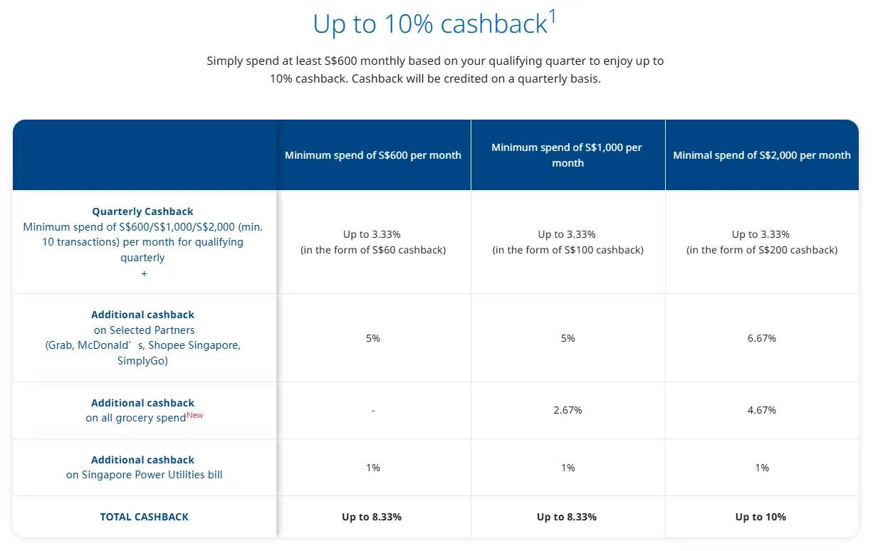 针对 Shopee, Grab, 7-Eleven 及 UOB Travel 有额外加成。需每季度连续三个月刷满指定额度。 |