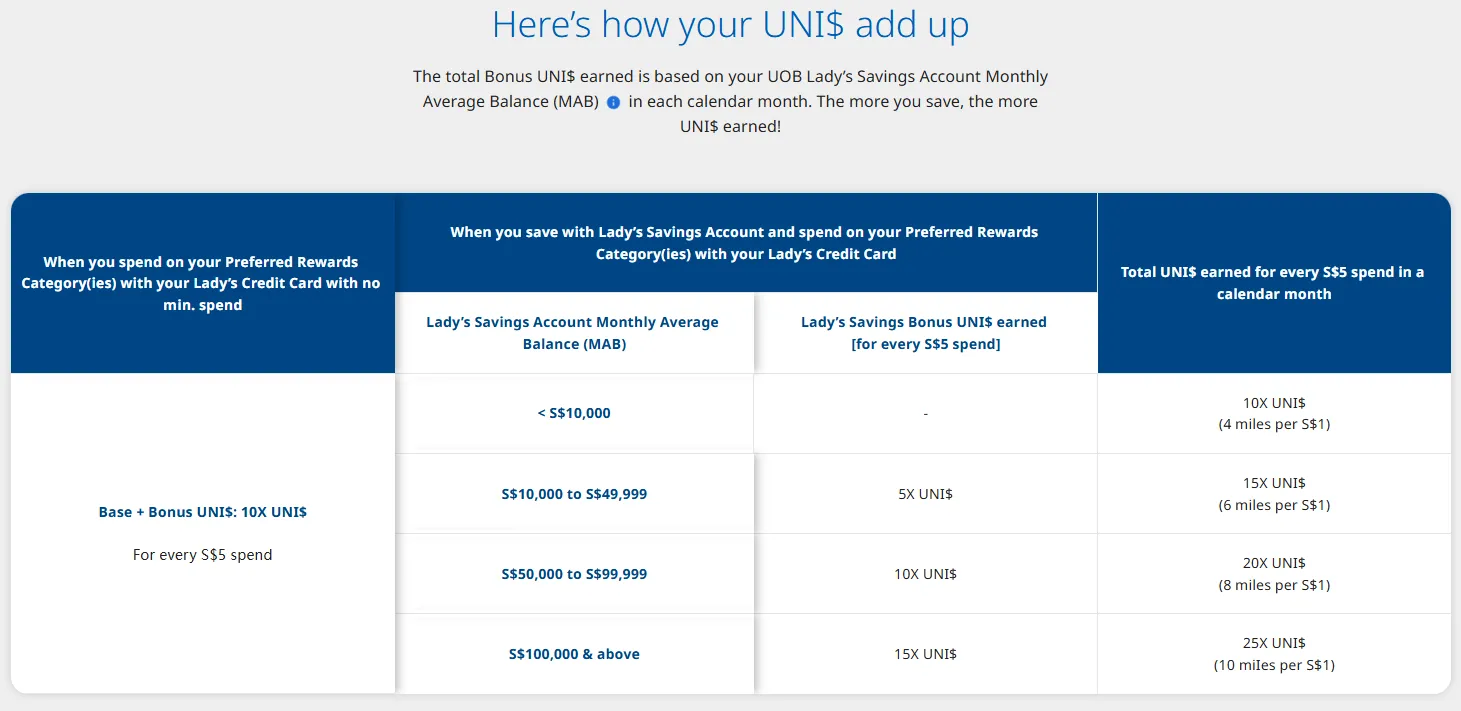 UOB Lady's Card (积分党福音):2026 年此卡延续了自选类别 4mpd (每 1 元 4 里程) 的高倍积分奖励。适合追求免费机票且在餐饮或美容上有大额消费的读者。