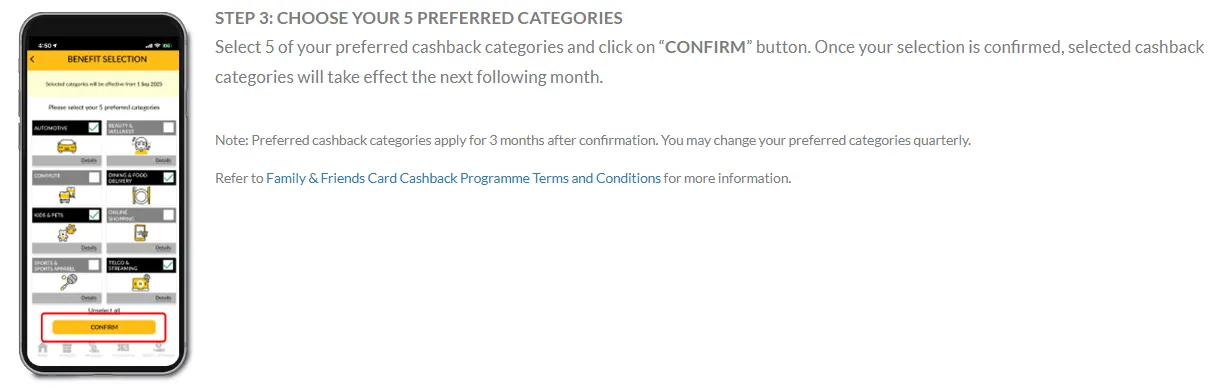 选择卡片: 点击你的 Family & Friends 卡面 -> 选择 "Manage Services" 或 "Manage Categories"。