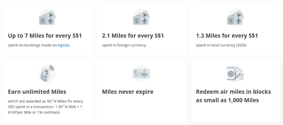 新户礼包: 核卡 30 天内累计消费满 S$1,000,通常可获赠 25,000 哩 (足够兑换一张去东南亚的商务舱单程票)。