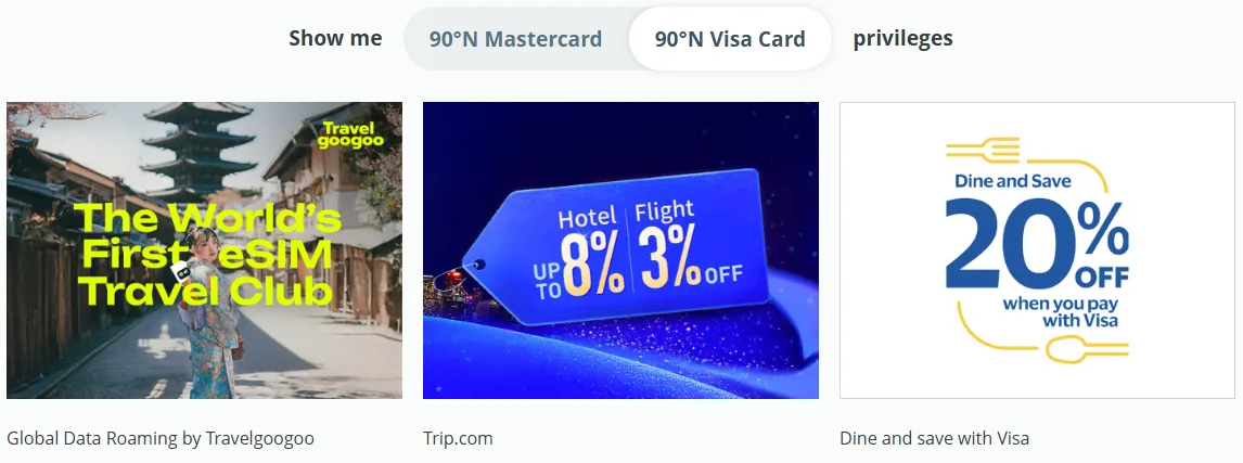 Visa 90°N:以前曾提供部分休息室折扣,但 2026 年福利基本与标准 Visa Signature 持平。它的优势在于偶尔有 Visa 专属的酒店预定返现。